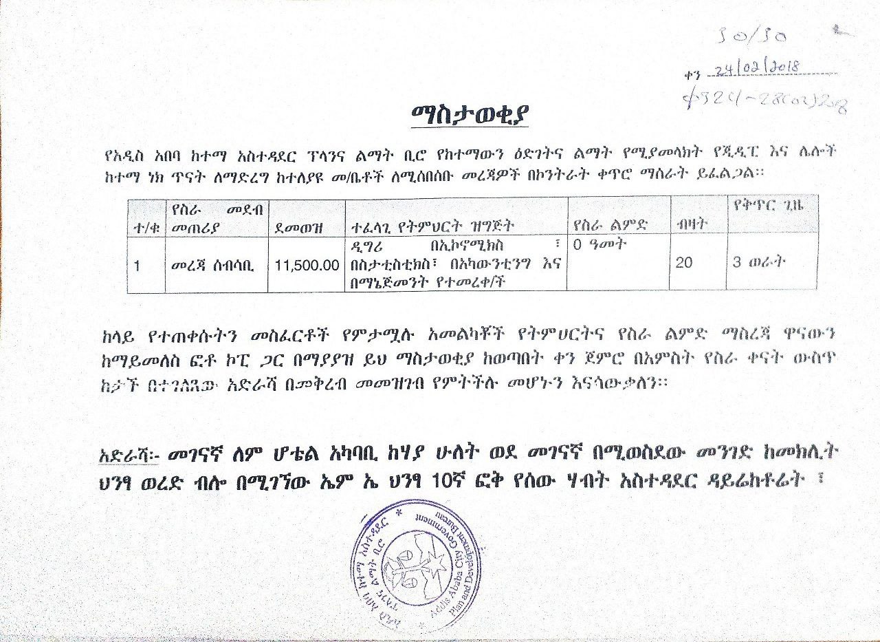 - Office: Human Resources Management Directorate, Addis Ababa City Administration Planning and Development Bureau