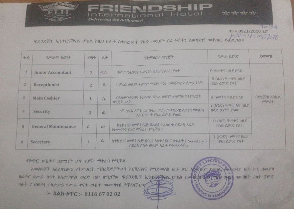 Job Opening at Friendship International Hotel Friendship International Hotel is looking to hire employees for the following positions. We are delivering the difference! 1. Junior Accountant Education: Accounting and Finance Degree Work Experience: 0 years and above Number Required: 2 2. Receptionist Education: Bachelor’s degree in Hotel or Tourism Management Work Experience: 0 (zero) years and above experience Number Required: 2 […]