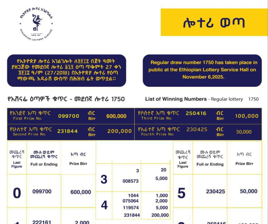 Regular Lottery 1755 Winning Numbers 2018 ( Medebegna) Regular Lottery 1755th was released today, January 7, 2018, at the Ethiopian Lottery Service in front of the public at the Lottery Hall. The released lottery numbers are attached