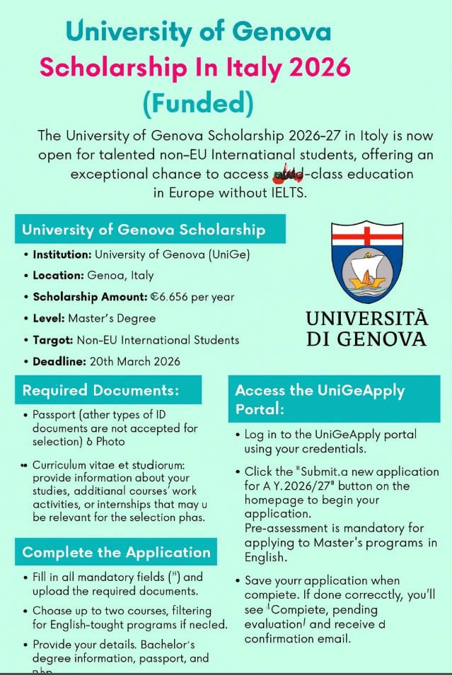 University of Genoa International Admission 2026 University of Genoa (UniGe) International Admissions A.Y. 2026/27 UniGeApply for Students with Non-Italian Qualifications The University of Genoa (UniGe) has opened its international admission portal, UniGeApply, for the Academic Year 2026/2027. This call is specifically for students holding foreign (non-Italian) qualifications who wish to enroll in Bachelor’s or Master’s […]