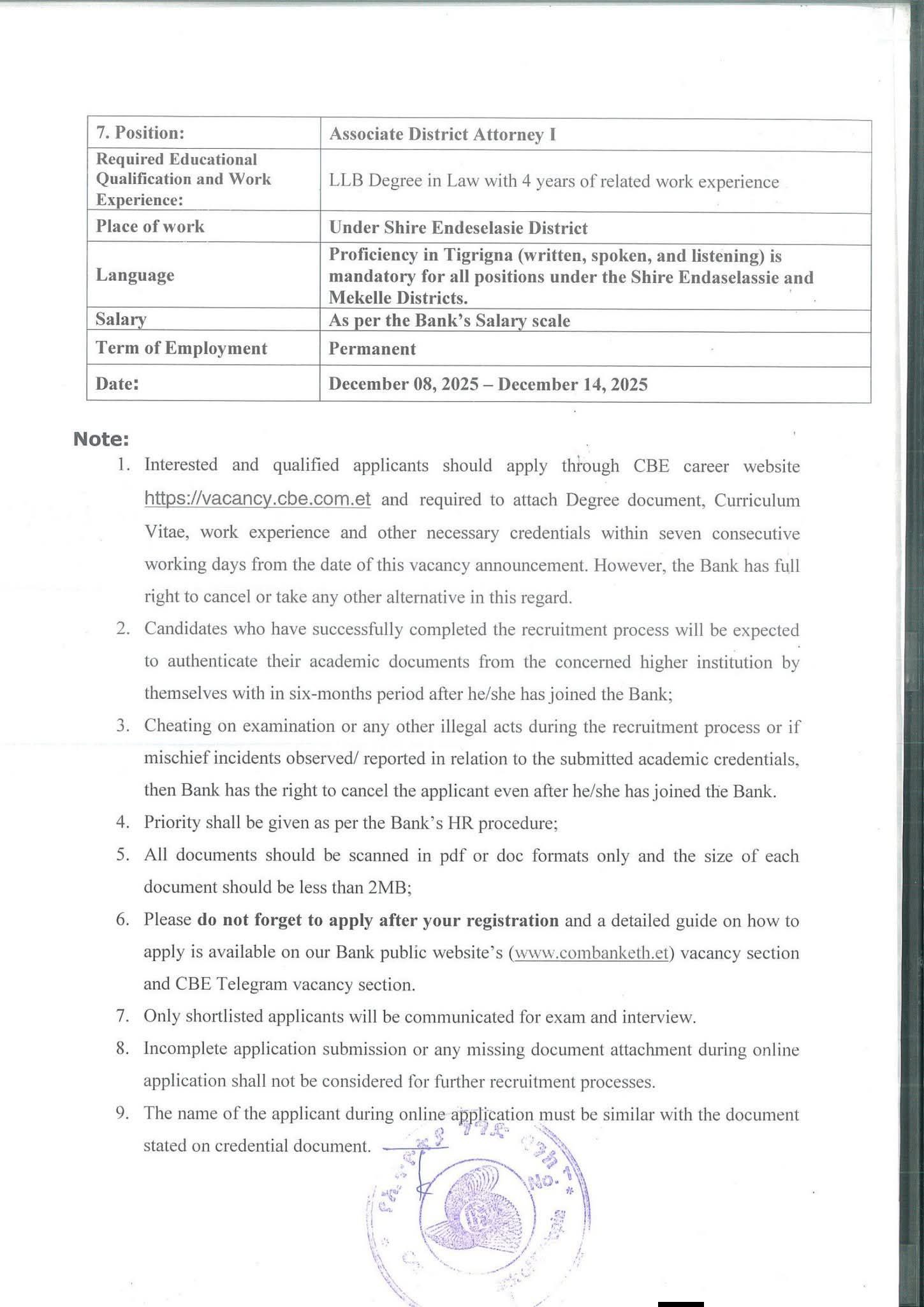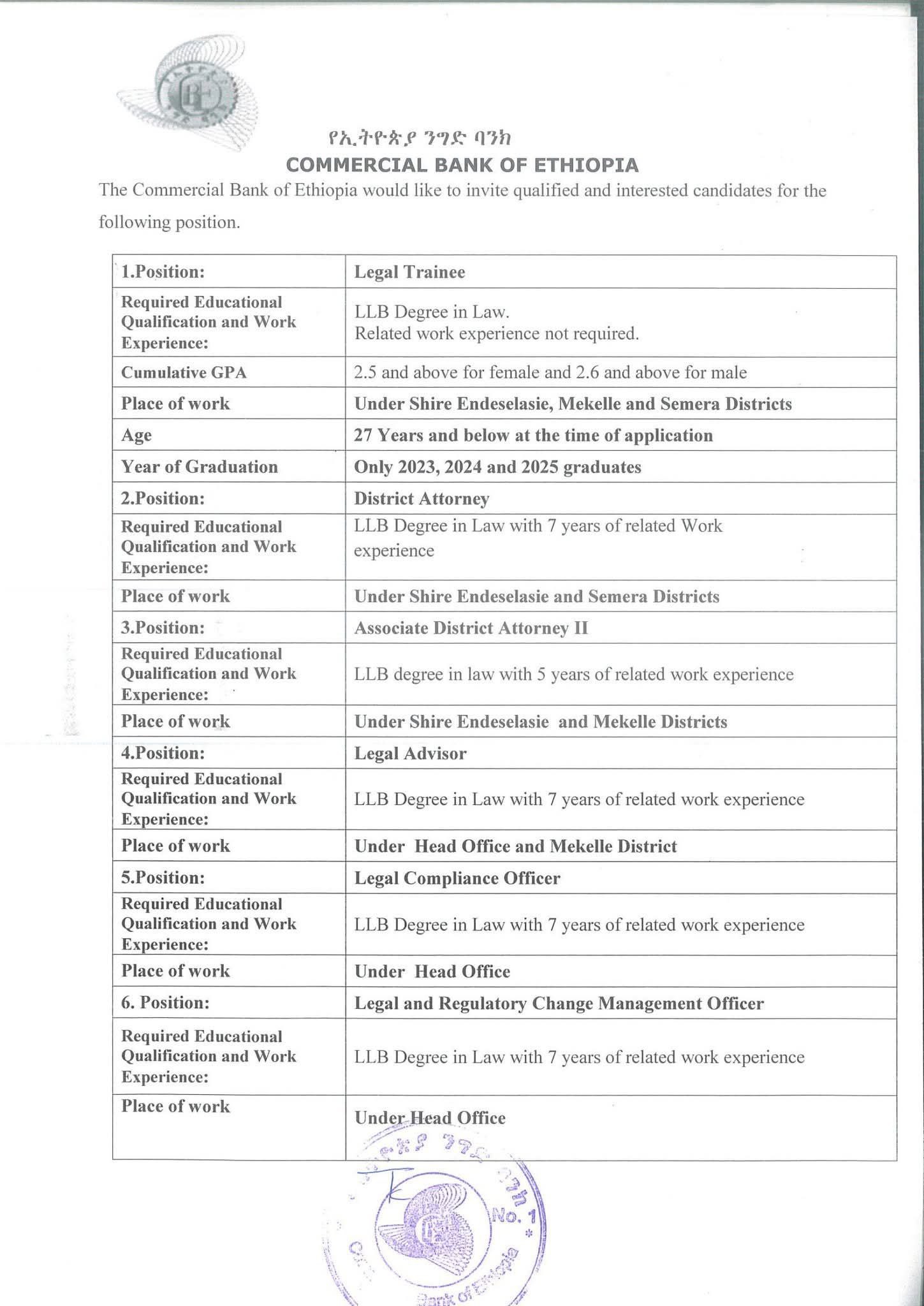 The Commercial Bank of Ethiopia (CBE), the leading financial institution in the country with a history dating back to 1942, is inviting qualified applicants for multiple legal positions.
