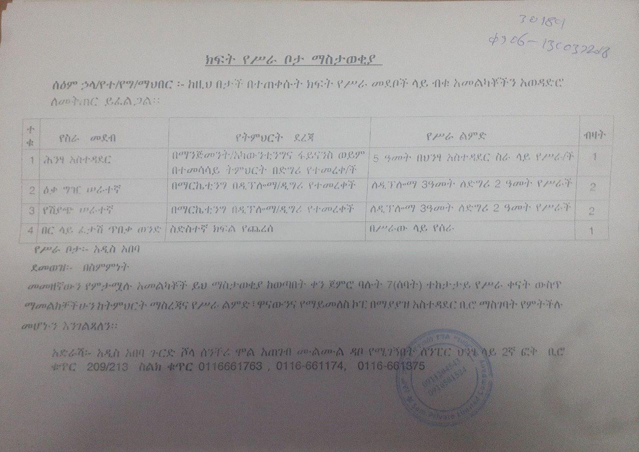 The company is seeking experienced candidates for management, digital marketing, and IT security positions at its Head Office in Addis Ababa. There is also a key permanent position for an Administration & Finance Officer in Gonder.