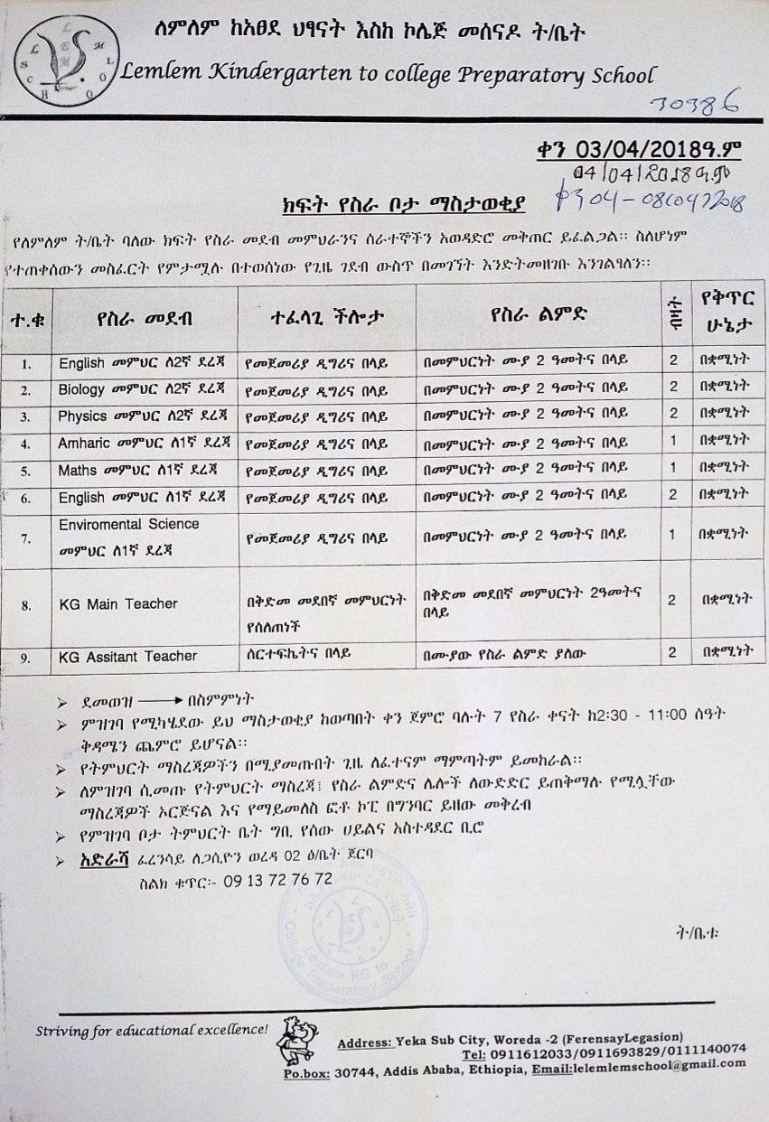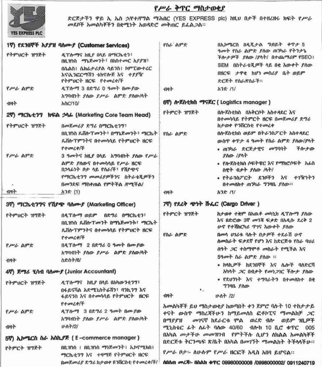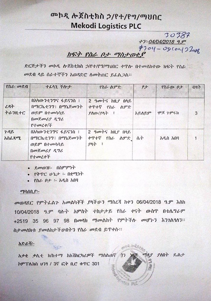 Our company Mekodi Logistics PLC is looking to hire employees for the following vacant positions.