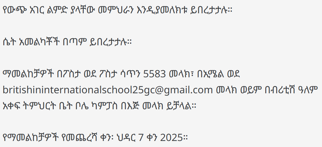 | Amharic Teacher | Degree | 1+ years |