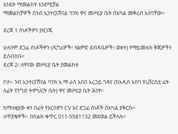 - Location: Nib International Bank S.C. Head Office Building, Ras Abebe Aregay Street (in front of Addis Ababa University, School of Commerce).
