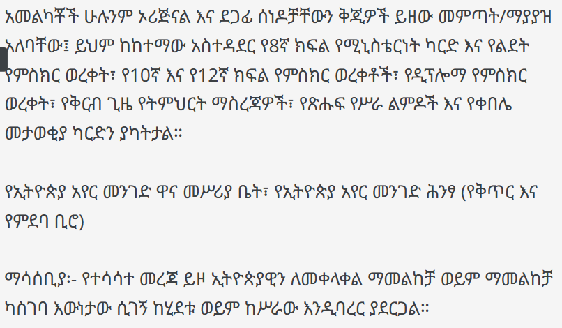 Note: Ethiopian Airlines is strict about document authenticity. If anyone is found to apply or join with false information, it will lead to subsequent termination from the process or employment upon discovery of the fact.