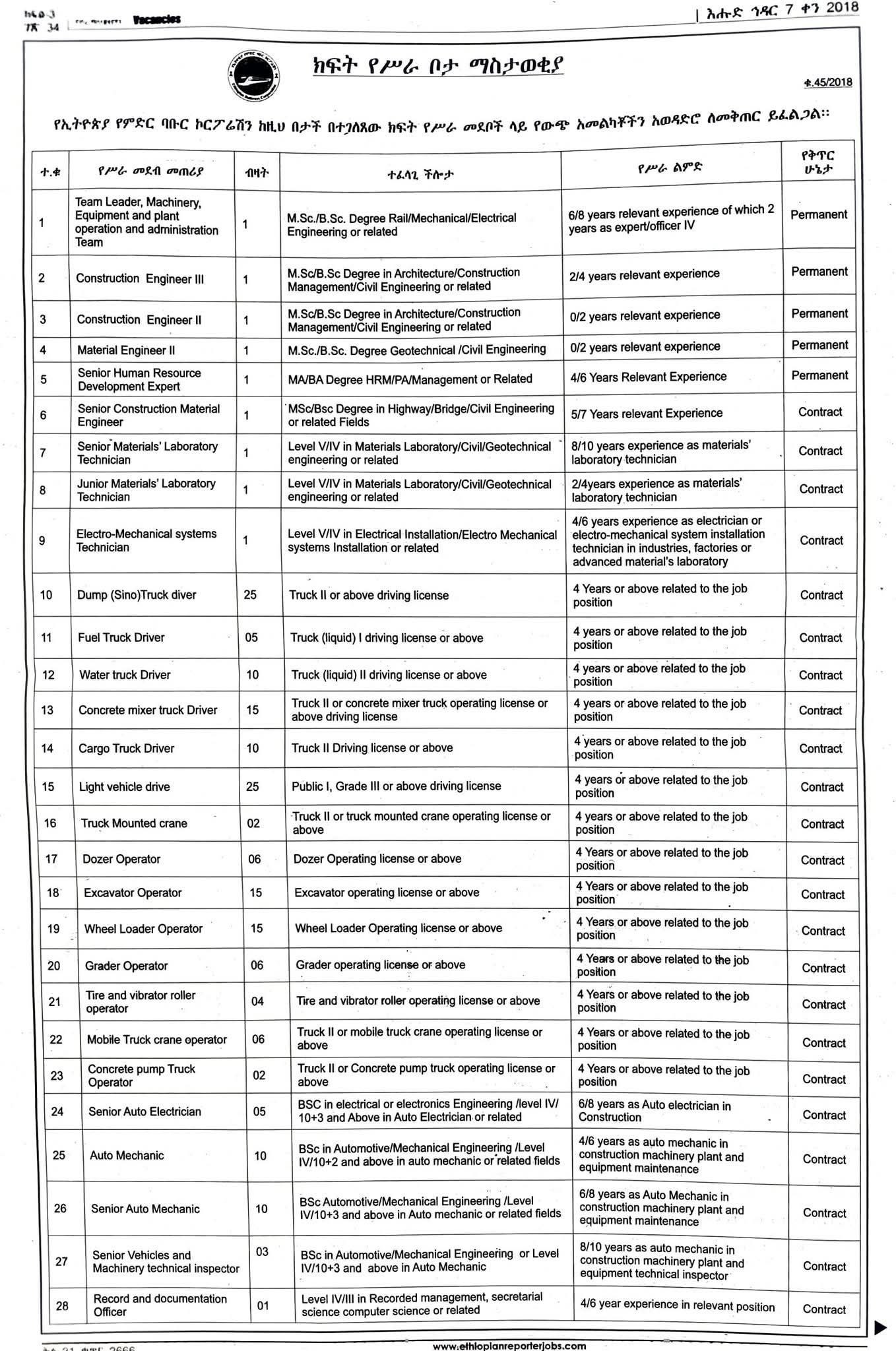 Ethiopian Railways Corporation invites interested and qualified candidates for the following positions.