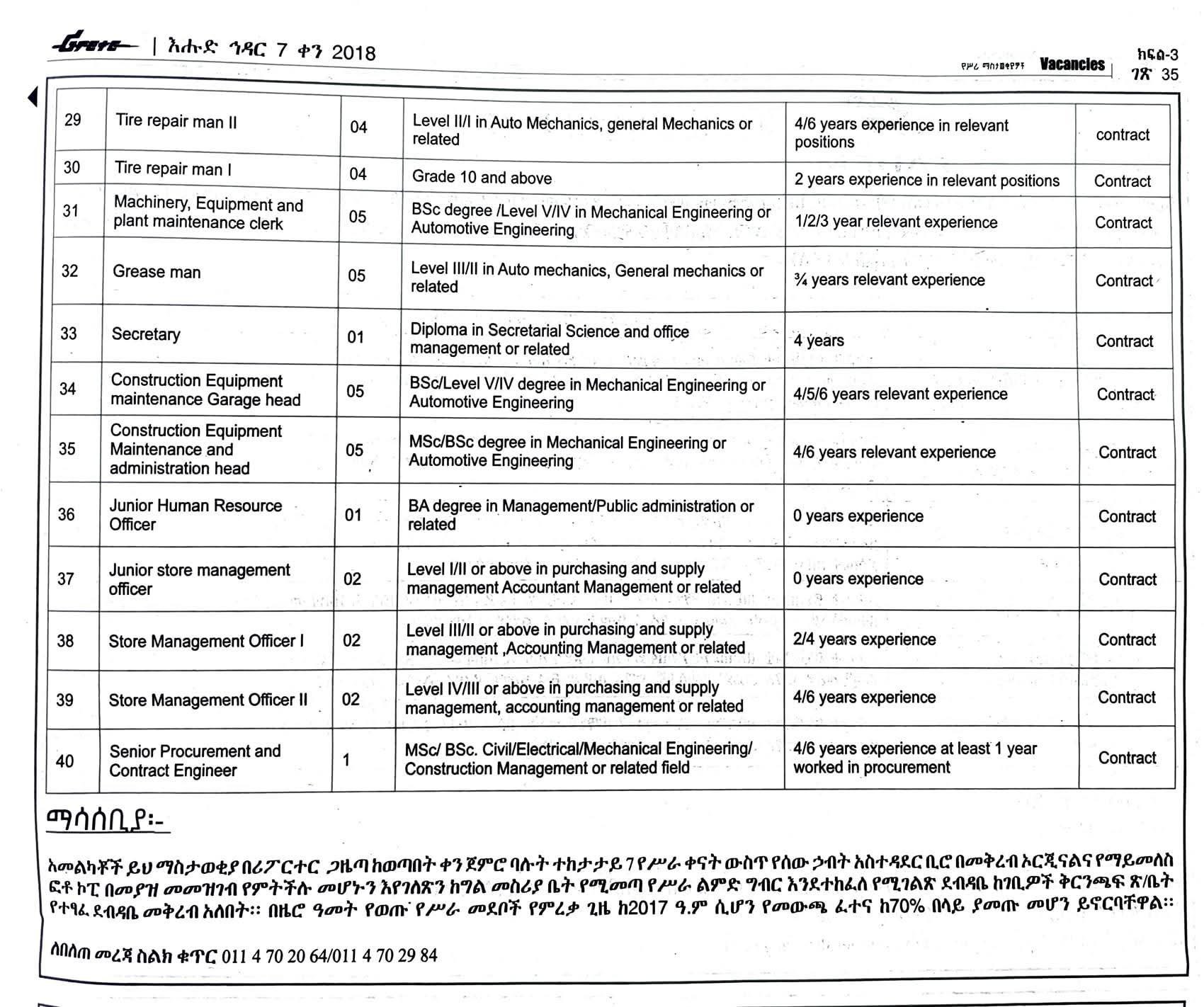 - Auto Mechanic (10 vacancies): BSc/Level IV in Automotive/Mechanical Engineering with 4/6 years experience.