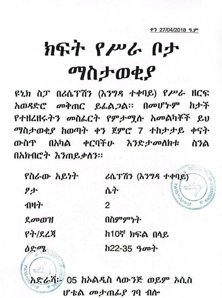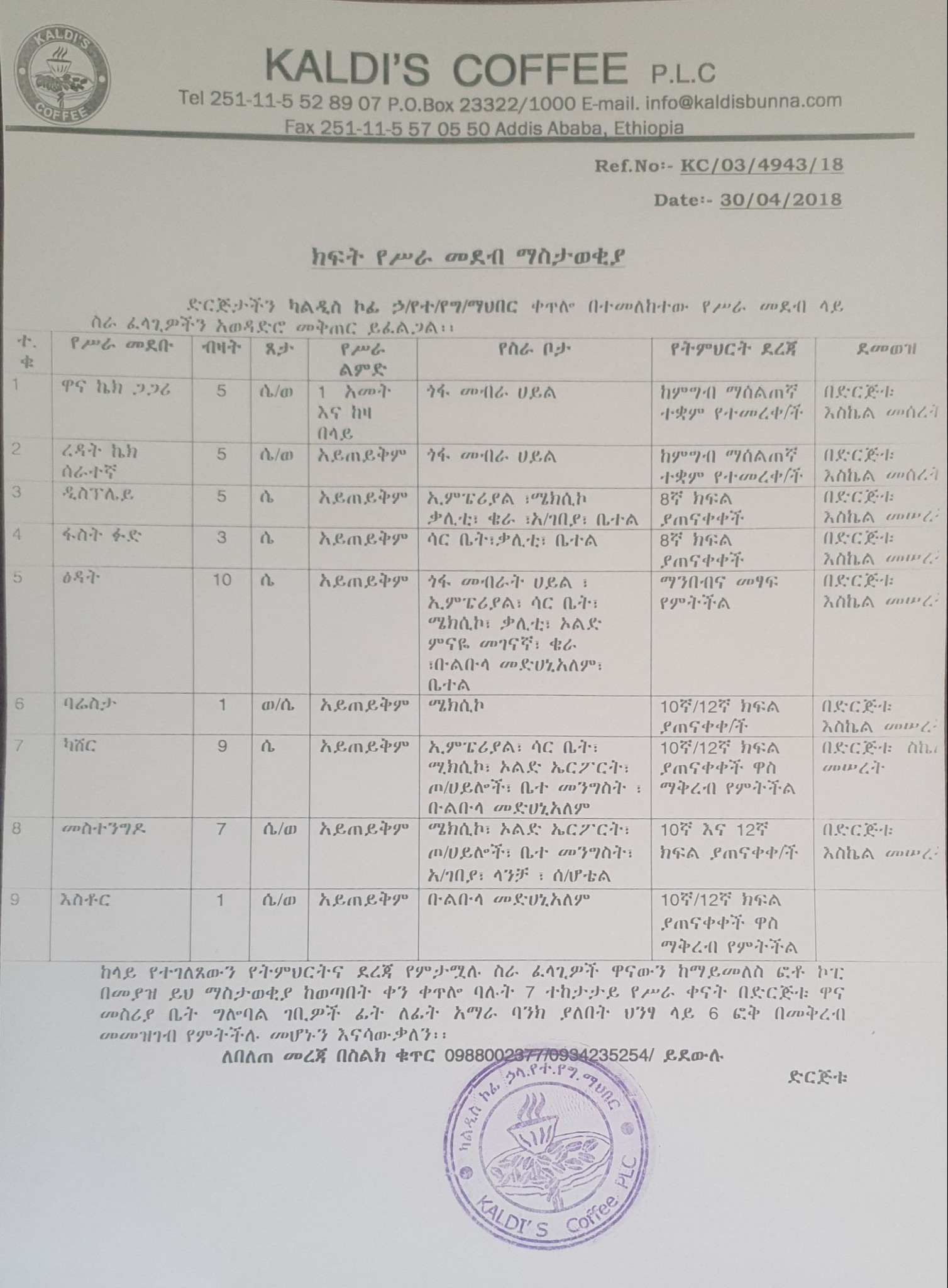 Kaldi’s Coffee PLC is hiring for multiple positions across Addis Ababa. We are looking for energetic candidates for our branches including Imperial, Mexico, Sar Bet, and more.
