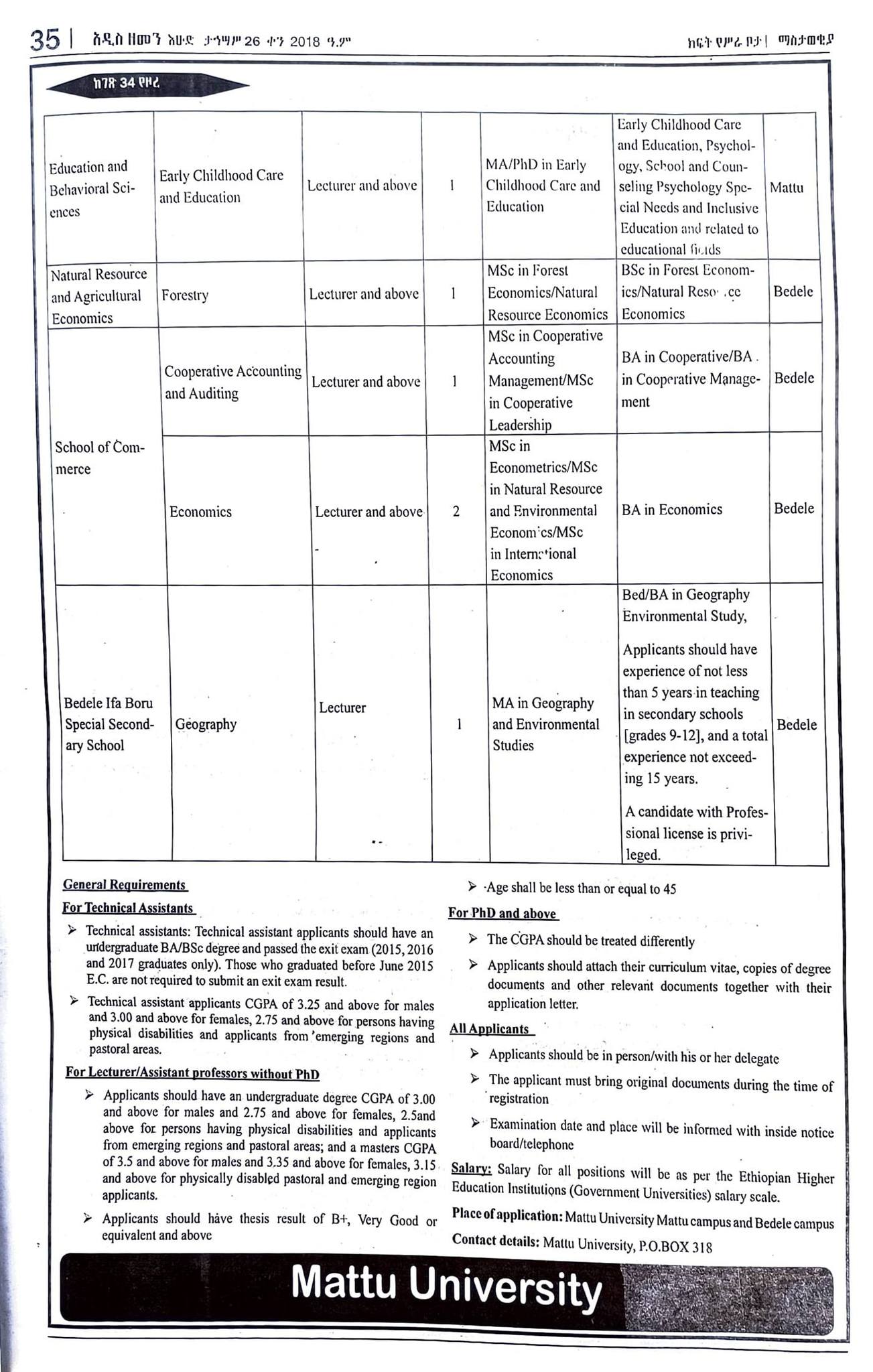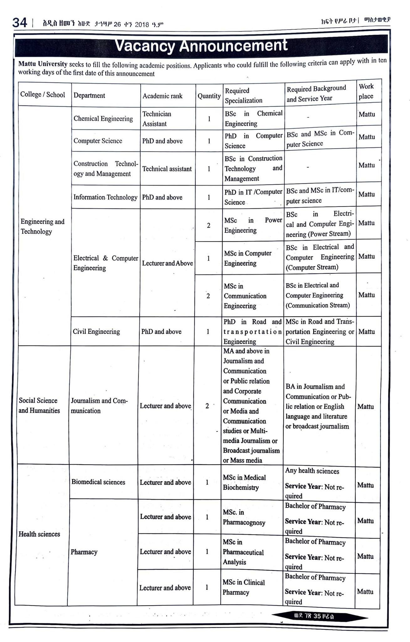 Mattu University invites qualified applicants for various academic positions. We are hiring for Engineering, Health Sciences, Business, and Social Sciences departments at both Mattu and Bedele Campuses.