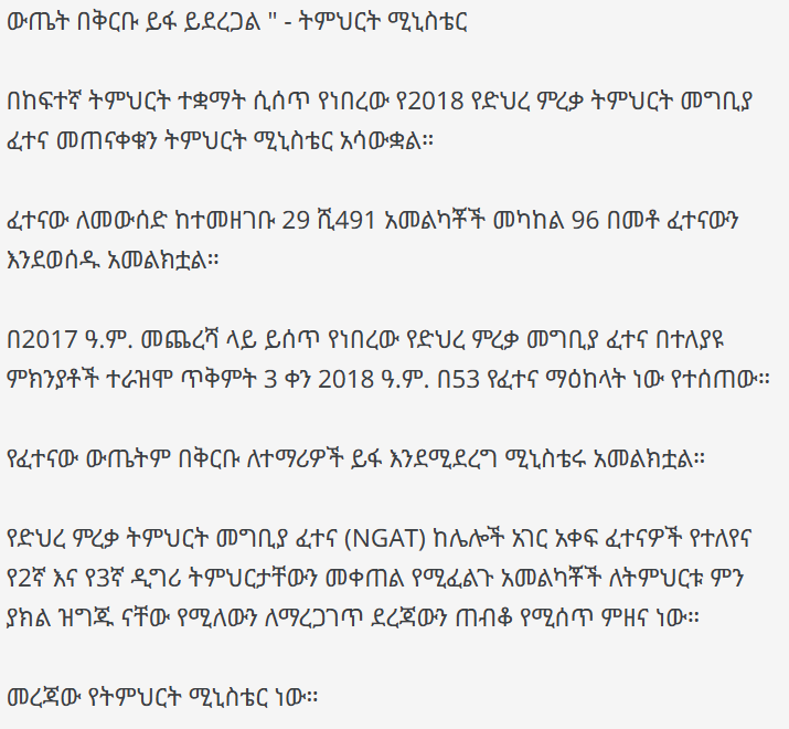 The Ministry of Education has officially announced that the 2018 E.C. postgraduate entrance examination, also known as the National Graduate Admission Test (NGAT), has been successfully concluded.