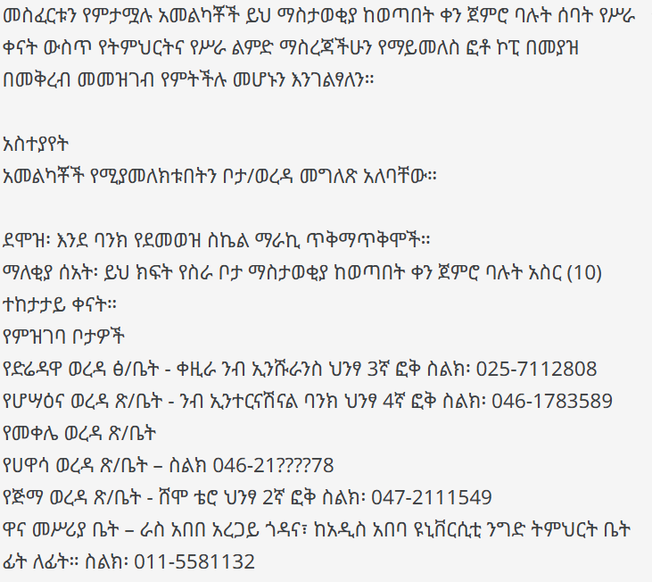 - For Head Office Positions (Addis Ababa): Head Office – Ras Abebe Aregay Street, in front of Addis Ababa University School of Commerce. (Tel: 011-5581132)