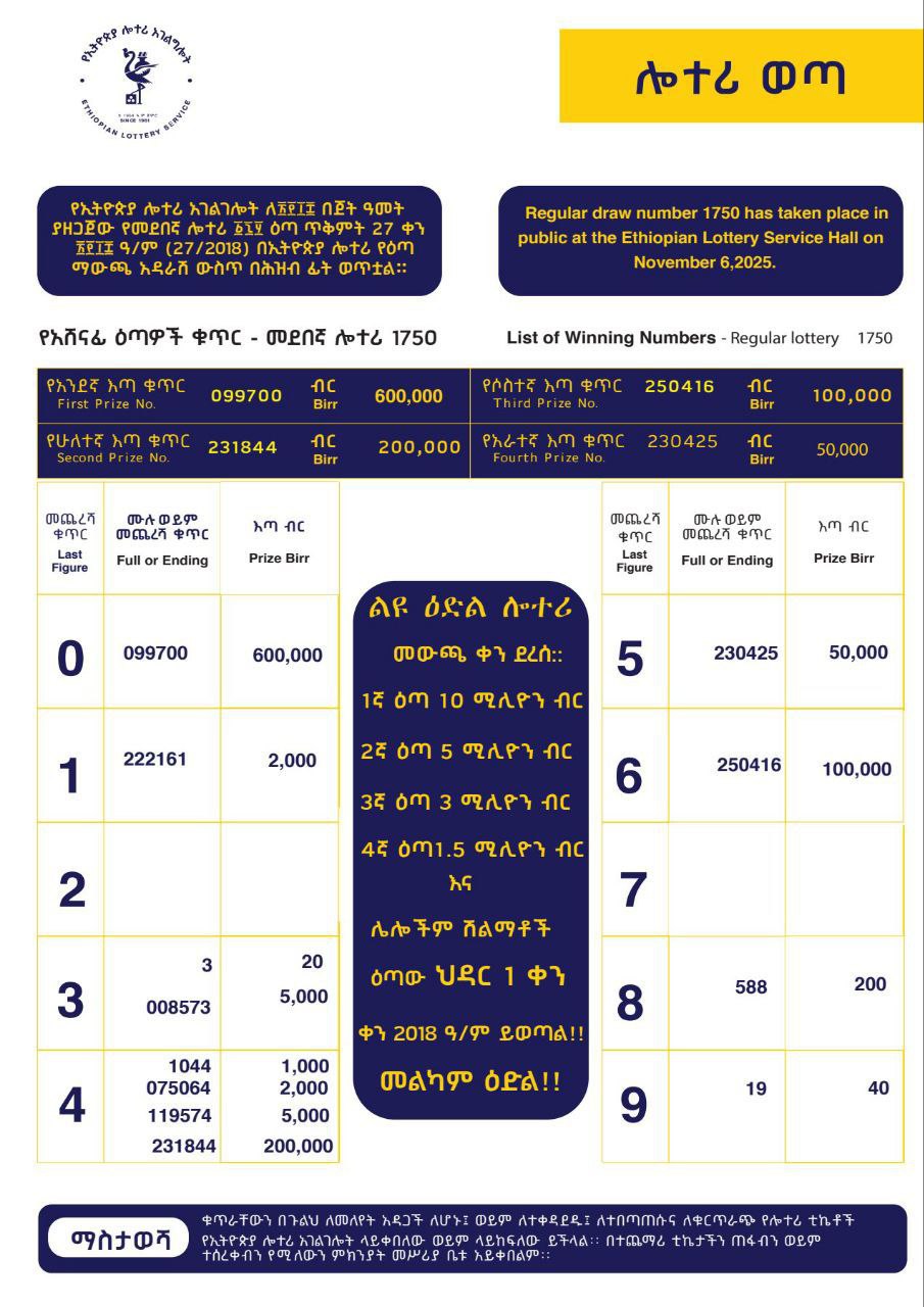 Did you buy a ticket for the Ethiopian Lottery Service’s 1750th regular draw? The wait is over! The draw took place at the Ethiopian Lottery Service Hall on November 6, 2025 (ጥቅምት 27, 2018 E.C.), and the winning numbers have been officially announced.