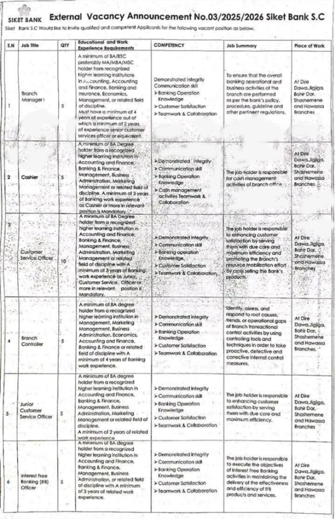 - Place of Work: At Dire Dawa, Jijiga, Bahir Dar, Shashemene and Hawassa Branches.