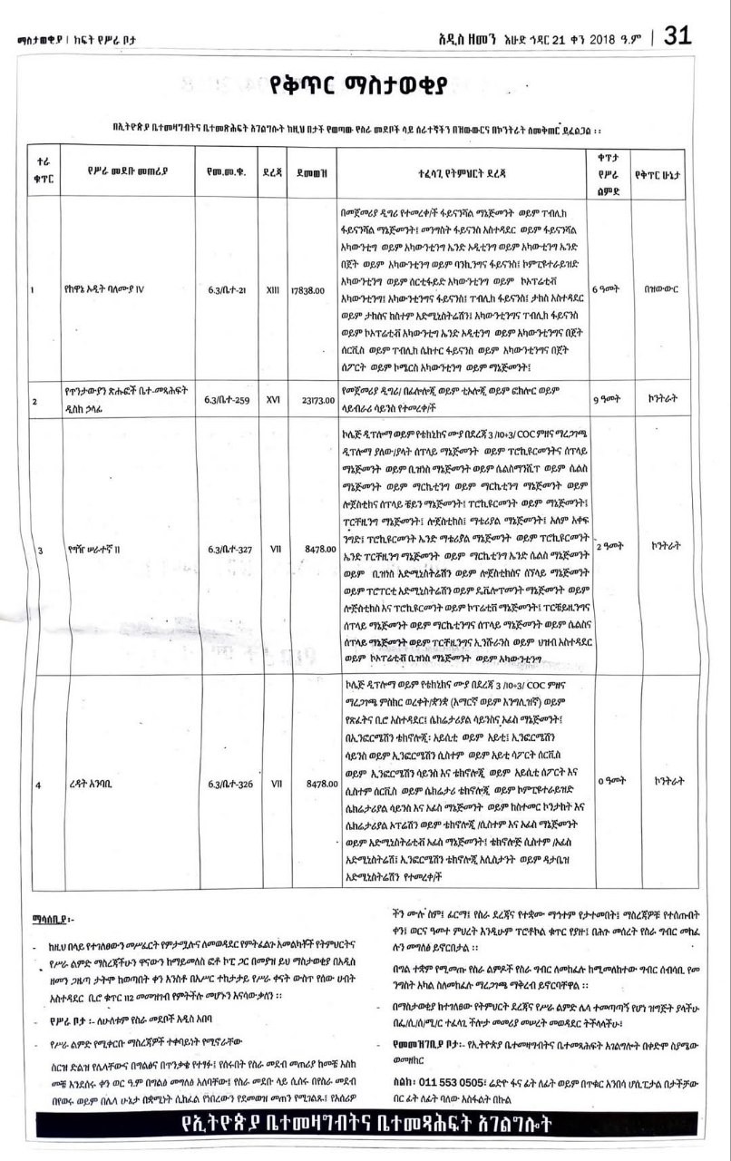 The Ethiopian Archives and Libraries are recruiting employees for the following positions on a temporary, transfer, and contract basis. Please review the table below for specific eligibility criteria.